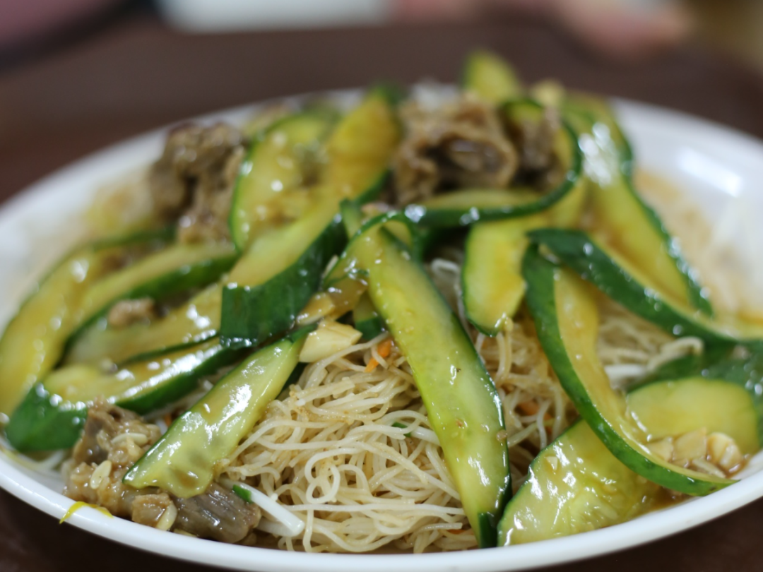 吃夜粥的标配是一碟香口的炒粉,青瓜炒米粉却是少见。为何搭配青瓜?“因为青瓜够爽口。”米粉炒香后,另起油锅炒青瓜猪面肉,勾芡后淋在炒米粉上。米粉吃起来既香口又不会那么干,难怪深受熟客喜爱。