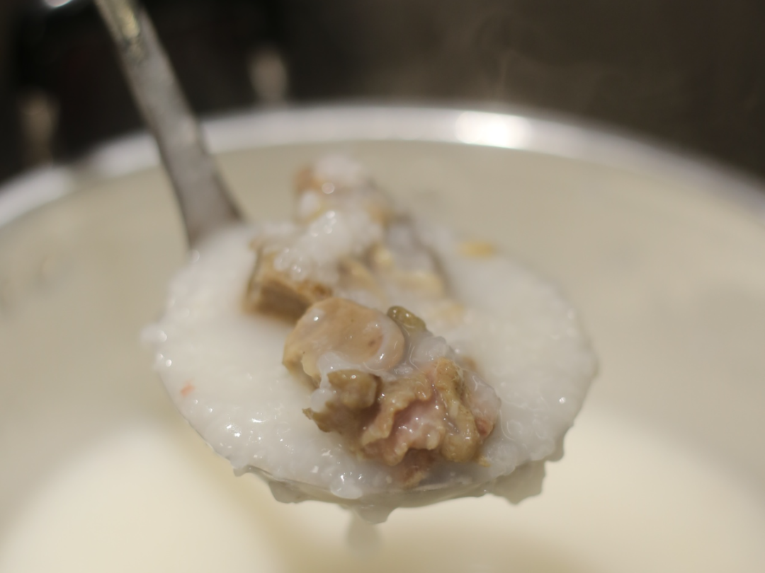 都说秋天的鲫鱼最肥美,也是鲫鱼抱籽的季节,但John却笑说:“带鱼春的母鱼其实不及公鱼的肉质鲜甜,所以鲫鱼‘吃肉要吃公,吃春要吃乸’。”重约1.2斤的鲫鱼,去骨起片后净重只有约3两,虽然只有小小一碟,但已足够鲜美。而让鲫鱼粥鲜上加鲜的,是藏在白粥里的小秘密——咸猪骨。