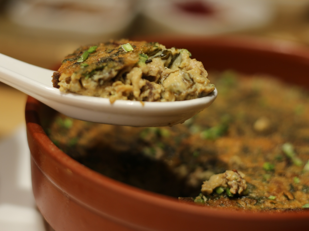 有人说,厨师的最高境界是“将九流的材料,烹成一流的美食”。鱼肠腥味极重,是旧时穷苦人家才会用的“下脚料”,但在厨师的巧手下,鱼肠焗蛋在粤菜中也有自己的一席之地。被焗得金黄焦脆的蛋皮下,鱼肠和蛋软滑顺口,胡椒的辛香与陈皮的果香更能凸显鱼肠的鲜味,非常香口。