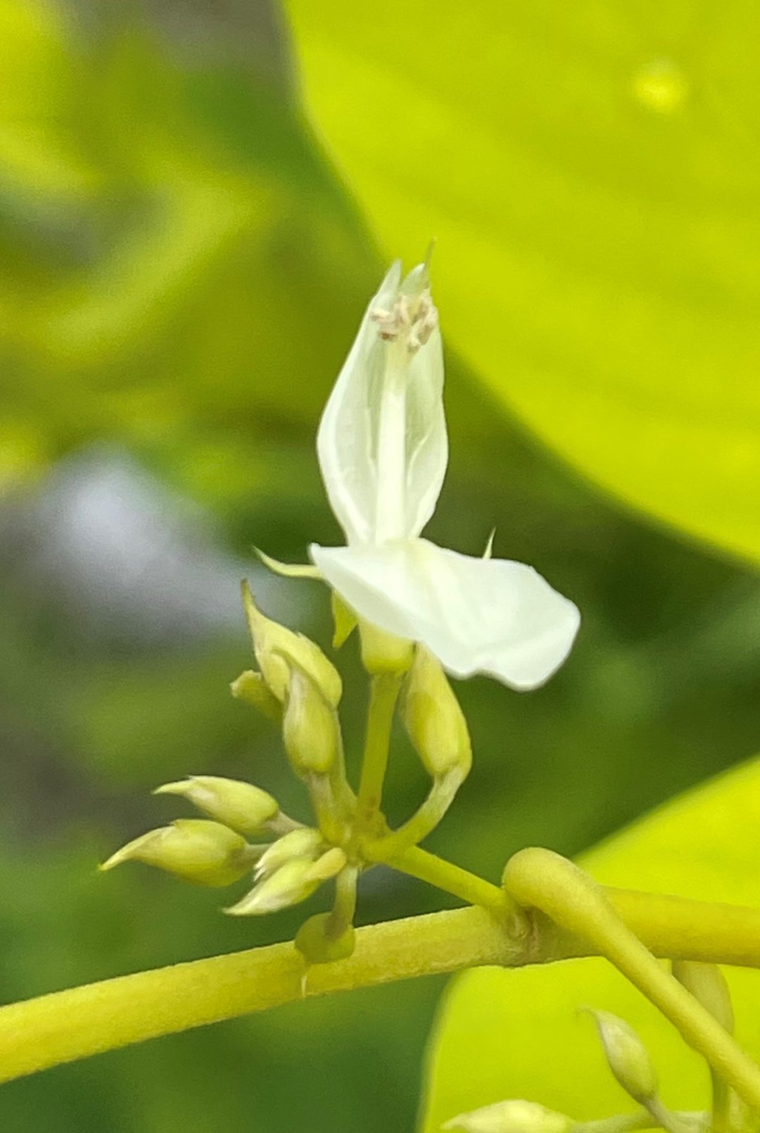 金叶伞花假木豆的花是纯白色的,花期在每年8月至9月,花相对叶子要低调很多,但也很别致。