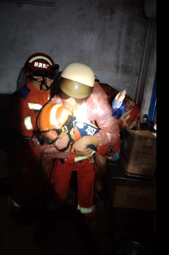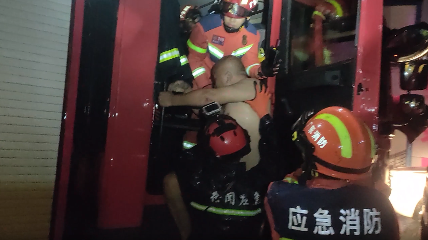 因道路已无法通行车辆,消防指战员徒步前往现场救援。经过3个多小时的步行及搜寻,最终于23时48分找到求助群众。当时,一名男性老人瘫坐在椅子上,其配偶在身旁守护,二人无法自行撤离。消防指战员在确保安全情况下,背起瘫痪老人,第一时间安全撤离现场。