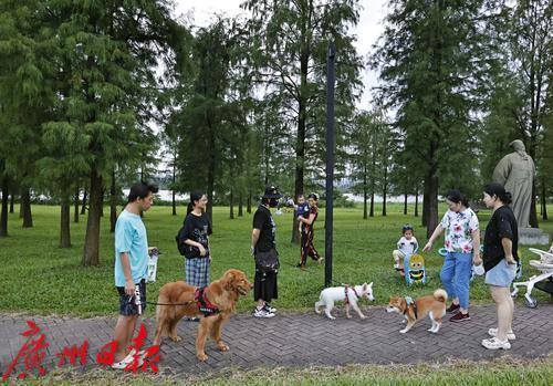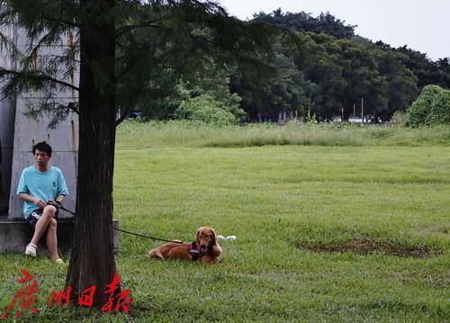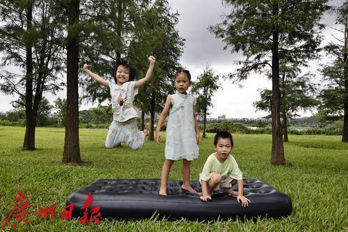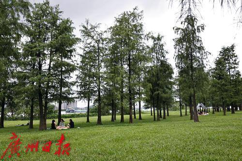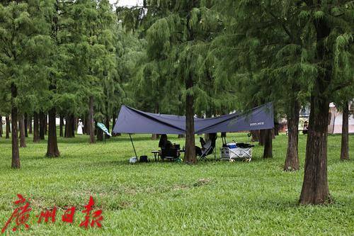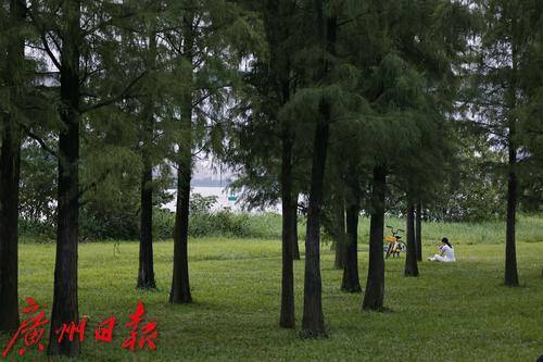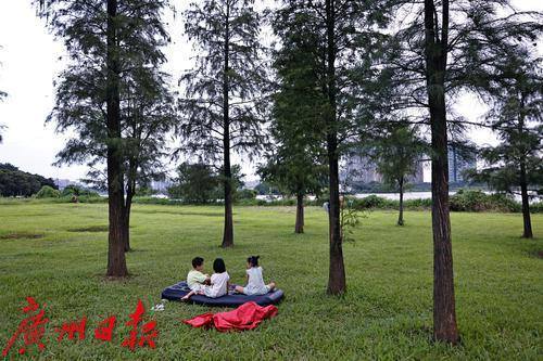 9月7日下午,阴晴的天空乌云飘忽不定,随时可能下起雨,这也使得天气凉爽起来。位于广州大学城江边的梁明诚雕塑园露营及散步的人多了起来,不少一家人席地而坐,孩子在绿草地上奔跑,放风筝,打球,公园沿江的绿林里,人们三三两两散落在其中,享受周末的闲暇时光。