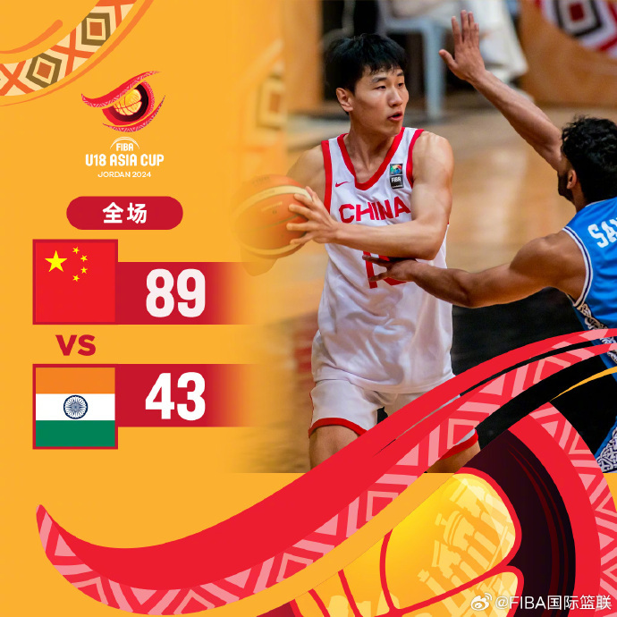 两队实力差距较大,中国队开局多点开花轰出18-2攻击波,随后中国队连中三分将优势扩大到20分以上,全场中国队牢牢占据场上主动,刘李贡献全场最高15分8个篮板,陈家政13分,彰华非、张博源均得到11分。最终,中国U18男篮89-43大胜印度U18男篮,同时获得瑞士2025年U19男篮世界杯入场券。