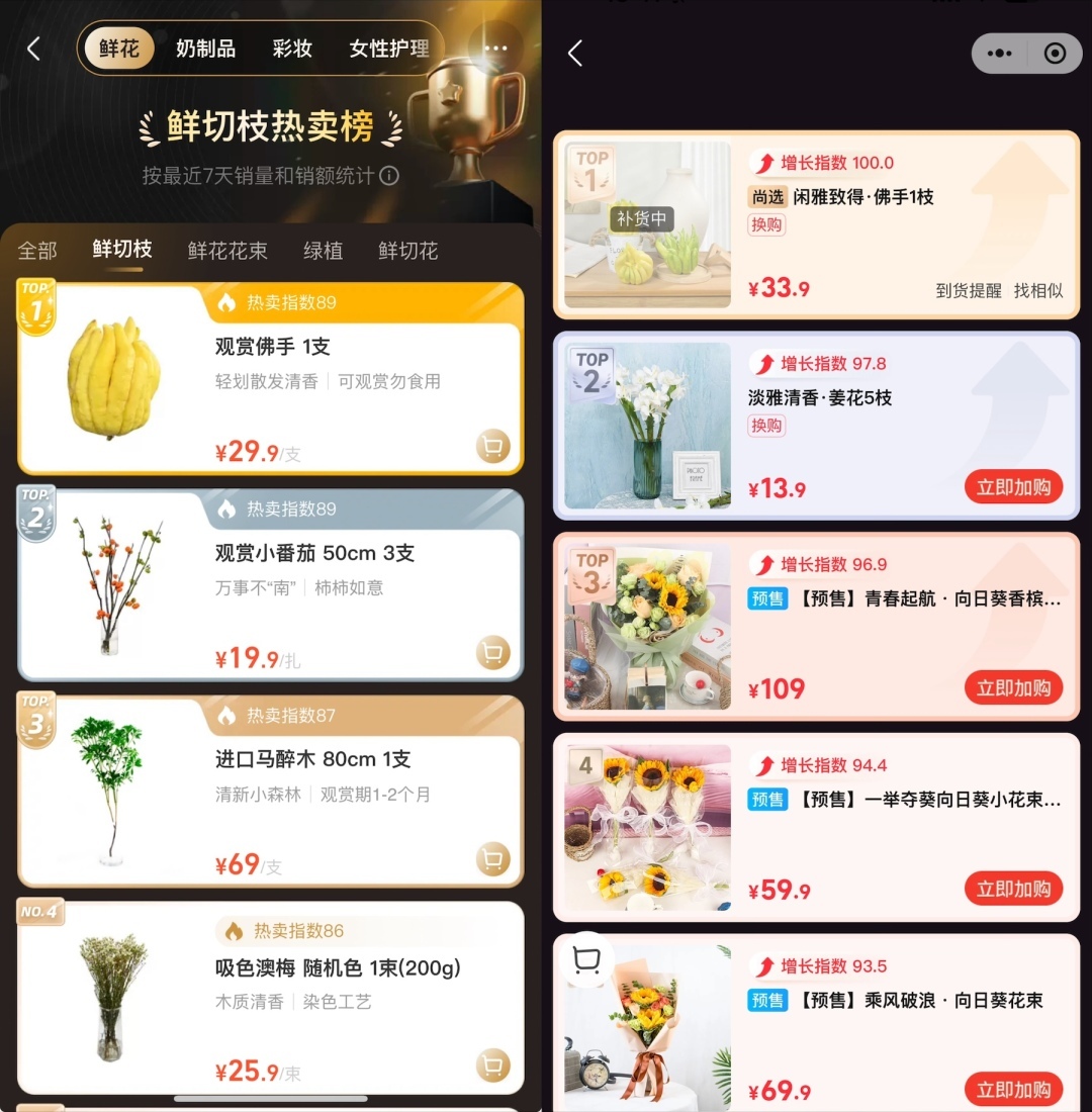 不只是直播间,在盒马、朴朴、小象等商超平台,观赏性佛手柑近两个月也荣登季节性热销花卉绿植的第一名榜首。盒马花园负责人履言告诉记者,他们从2023年8月份开始推出佛手柑,上市即冲进鲜花销售榜TOP5;今年更提前两个月上市,依然成为热销榜爆火的好花材,今年8月销售同比上涨142%。