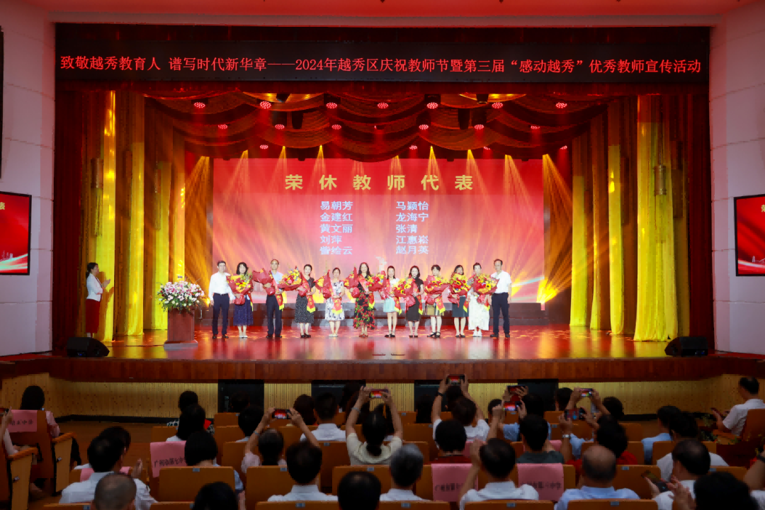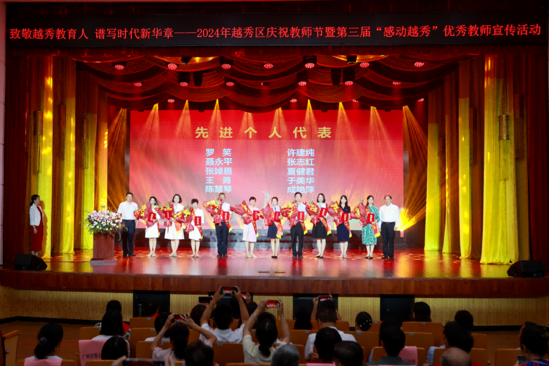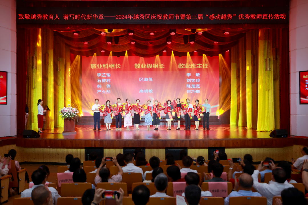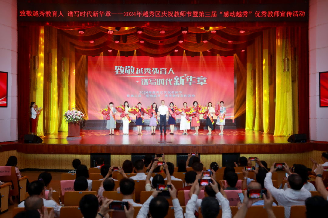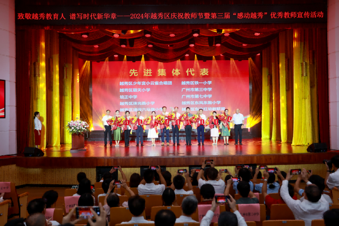 9月6日上午,“致敬越秀教育人 谱写时代新华章”——2024年越秀区庆祝教师节暨第三届“感动越秀”优秀教师宣传活动在越秀区少年宫小云雀剧院举行。活动为10个优秀集体代表、10位先进个人代表、10位“敬业”系列教师代表授予荣誉,并公布了2024年“感动越秀”优秀教师名单。