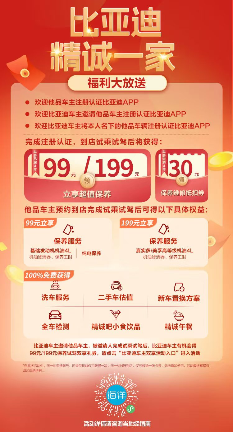 99元就能做保养?是的,你没听错,比亚迪精诚一家福利大放送,诚邀合资品牌车主认证+到店试乘试驾,可享99元/199元保养、免费洗车等权益,详见活动图或咨询当地附近的经销商。