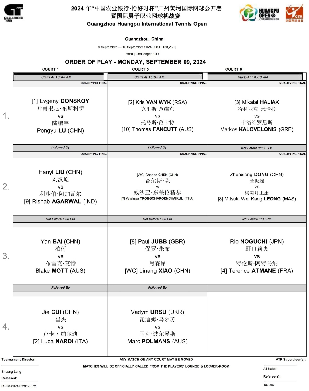 9月9日,广州黄埔国际网球公开赛将进行资格赛第二轮及部分第一轮男子正赛单打比赛的争夺。
