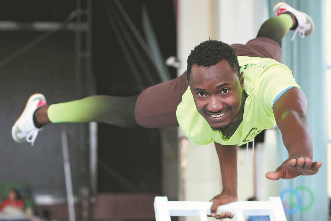 Kenyan acrobat Judah Patrick Mulwa shows off his strength and balance at Wuqiao Acrobatic Art School on Aug 24. WU XIAOHUI/CHINA DAILY