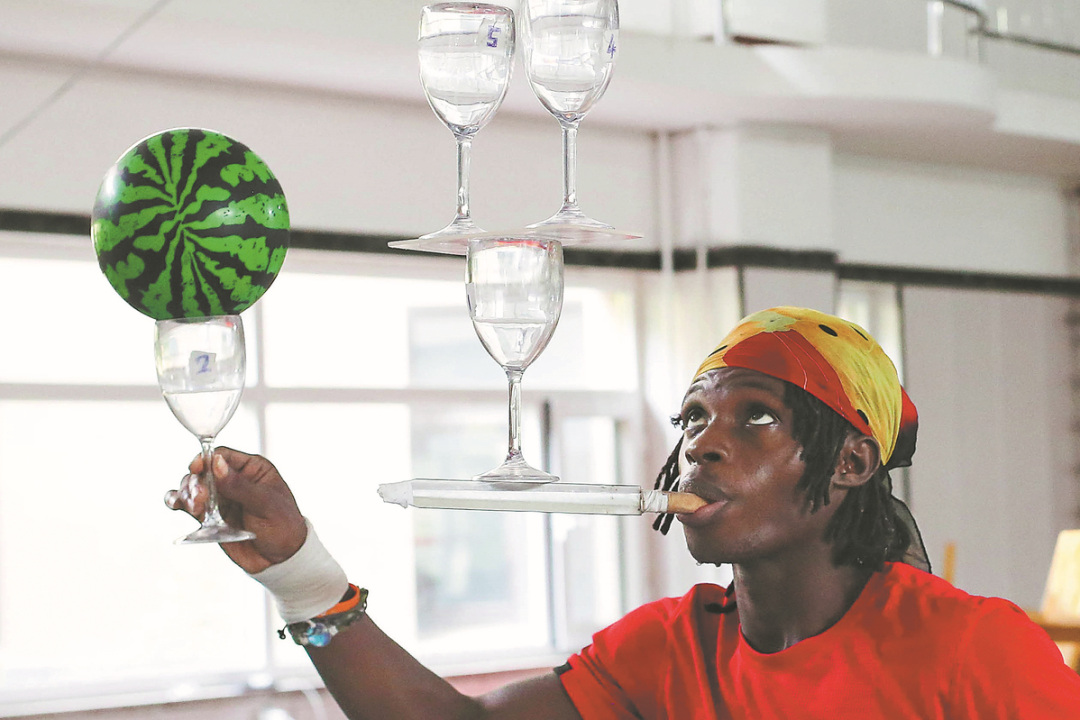 An acrobat from Sierra Leone demonstrates his steady hand and composure at Wuqiao Acrobatic Art School on Aug 23. WU XIAOHUI/CHINA DAILY