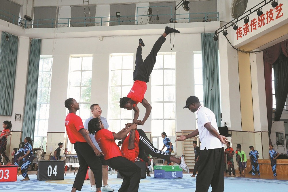 Mathias Kavita (right) and Xu Yang (back) assist Kenyan students with acrobatic moves at Wuqiao Acrobatic Art School in Wuqiao county, Hebei province, on Aug 23. WU XIAOHUI/CHINA DAILY