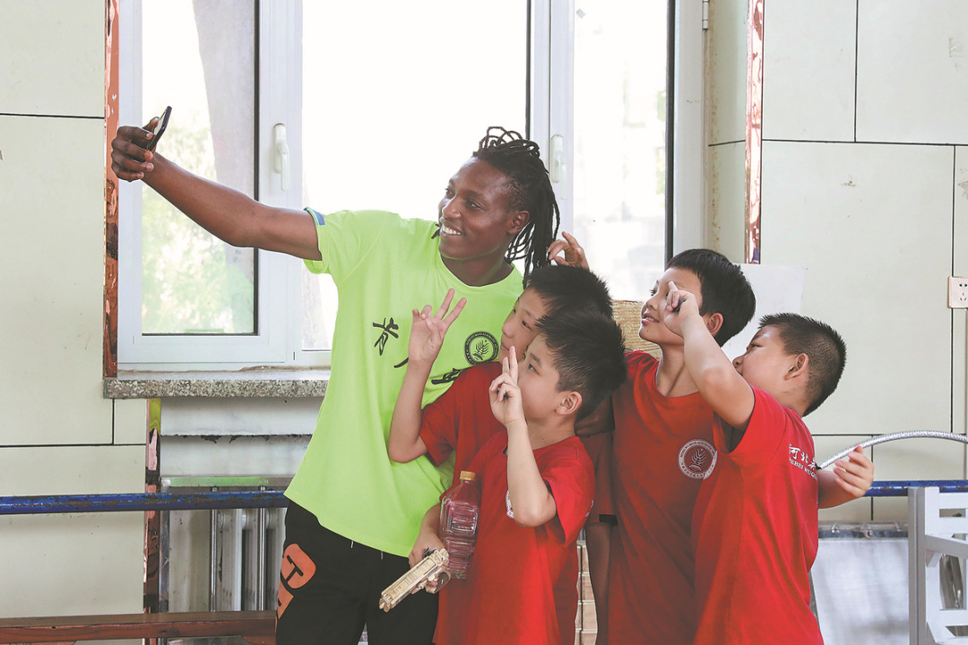 Kenyan acrobat Peter Maina takes a selfie with Chinese students from Wuqiao Acrobatic Art School on Aug 24. WU XIAOHUI/CHINA DAILY