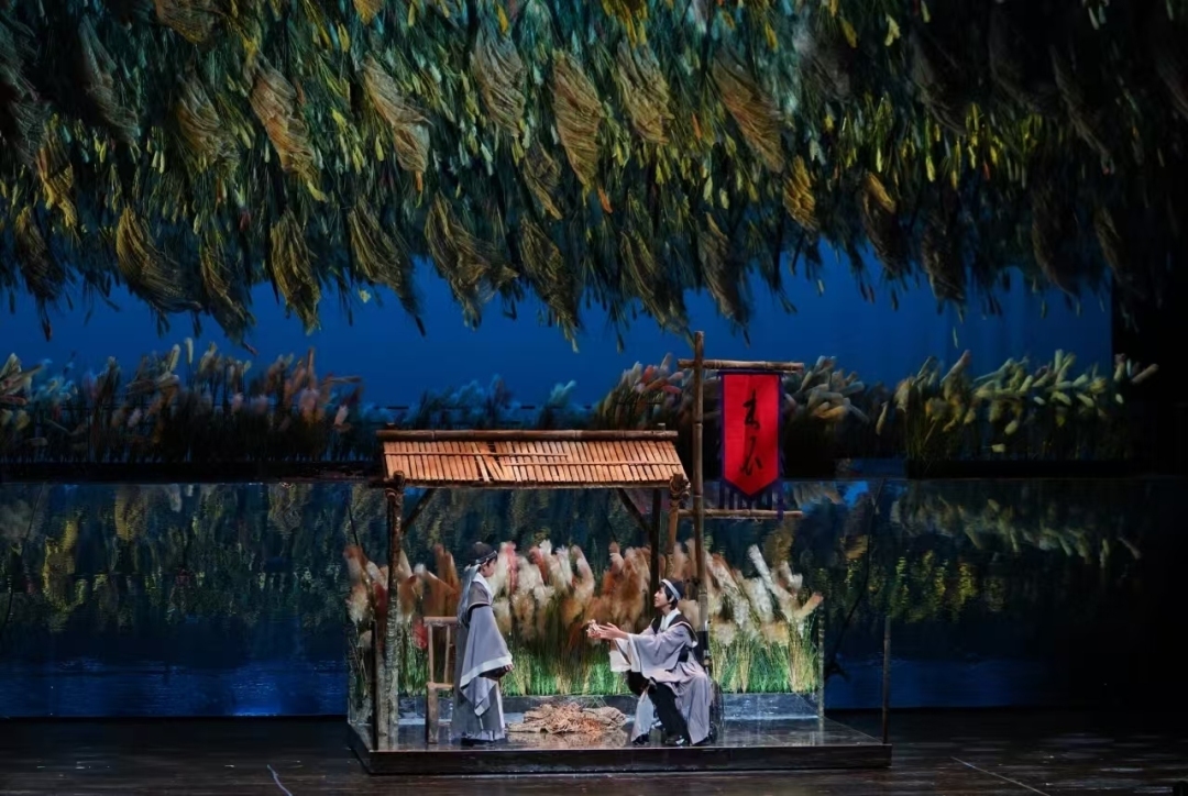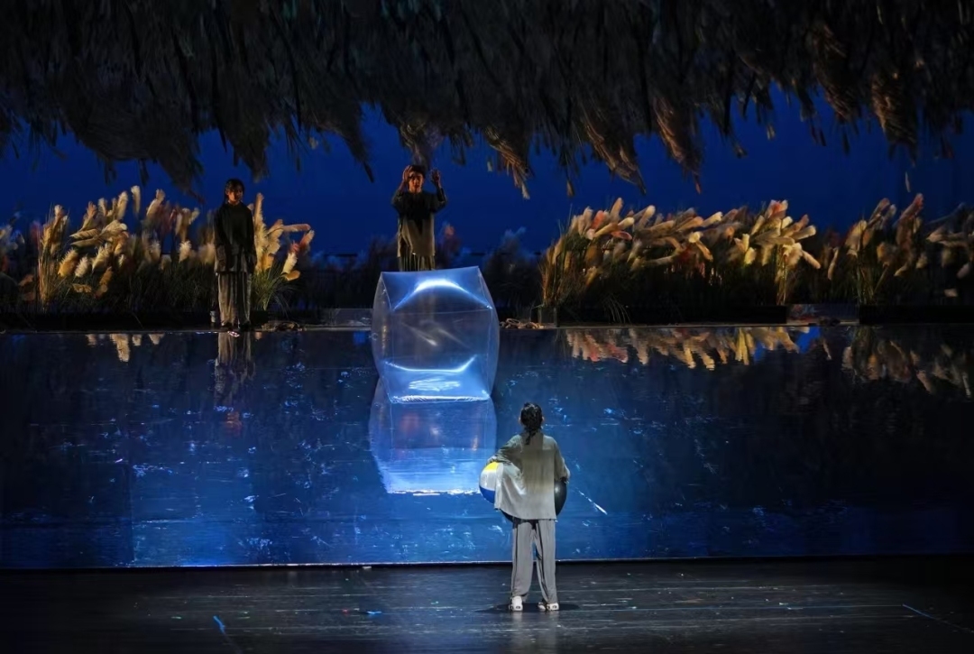 舞台上起舞的芦苇荡更在童真之上为剧目增添了一层浪漫,舞美设计谷旻雯说,“《诗经海海》让我联想起鲁迅先生笔下的《从百草园到三味书屋》。童年与成长似乎就在野草丛生的百草园与学堂的那段距离里。把童年与生命的成长放置在芦苇荡里,在镜面平台的水天之间,自有一番我们中国人独有的天人合一自在与浪漫。在镜面平台与芦苇荡之间的攀爬与飞奔间,成长已至。”