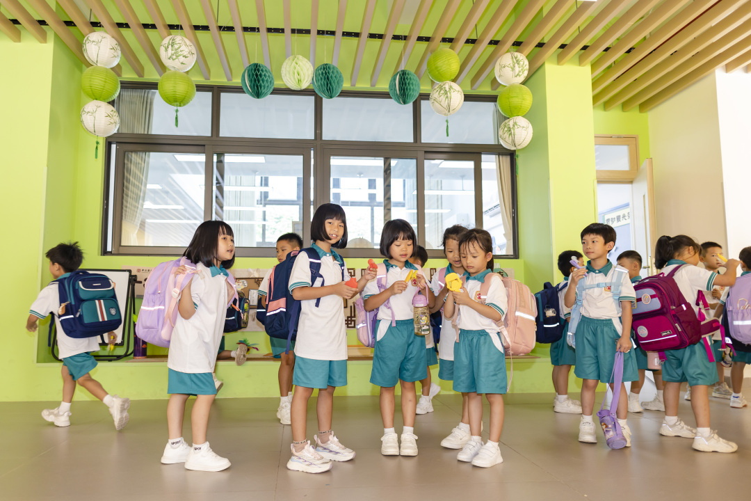 此外,校内的空间设计也体现了学校以生为本、适性而育的理念。各班老师特意在课室内打造了“幼小衔接区”——设置“动”“静”两类活动空间,例如课室后方设置有积木游戏区、绘画区、拼音识字区等,前方讲台旁则安置了一方图书角和软沙发。教室设计之变背后,是教育观的转变,力求让各个角落成为学生探索知识、“玩中学”“学中玩”的场所。
