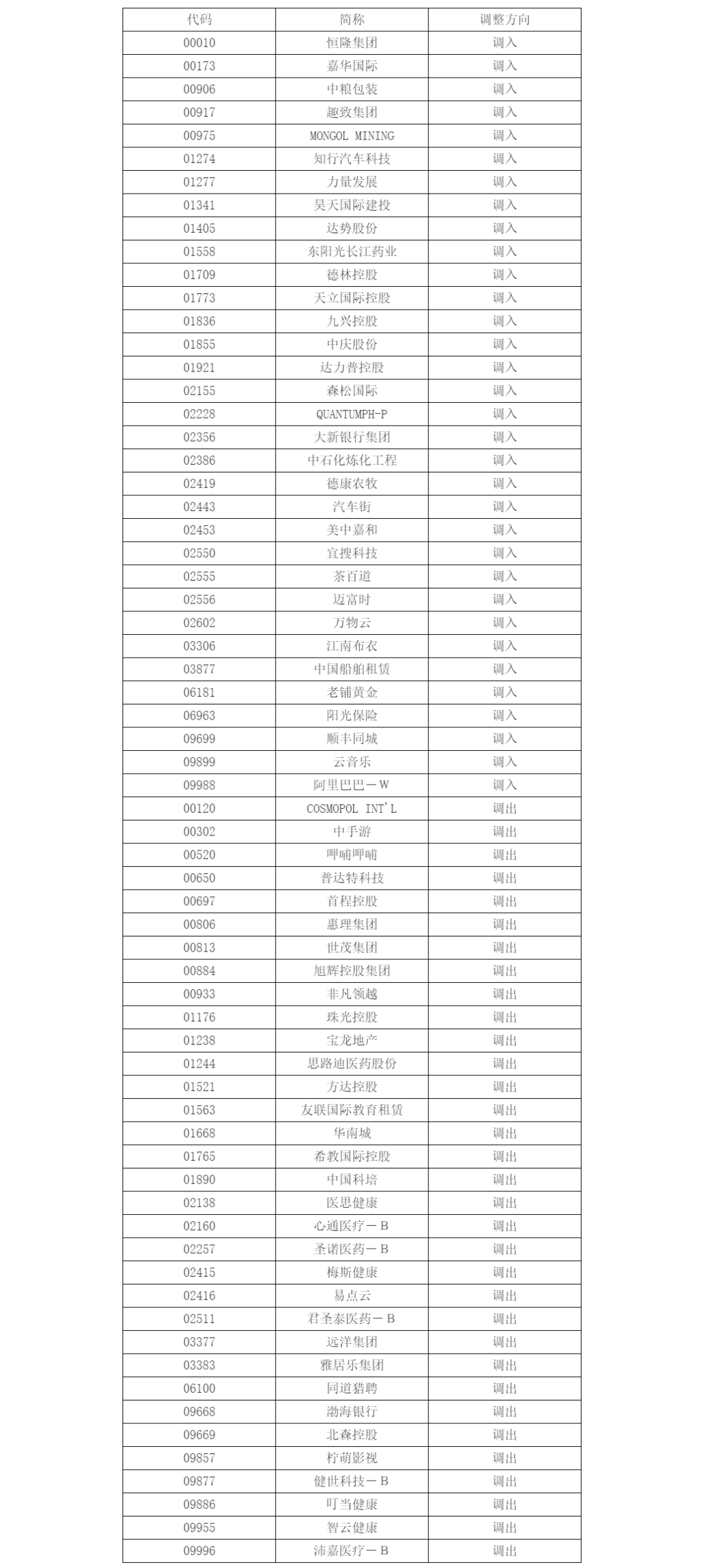 公告显示,阿里巴巴、知行汽车科技、顺丰同城、恒隆集团、嘉华国际、中粮包装、天立国际控股、九兴控股、中庆股份、大新银行集团、中石化炼化工程、德康农牧、美中嘉和、茶百道、江南布衣等33只股票获调入。这也意味着,9月10日起,南向资金将可以通过港股通购买阿里巴巴等股票。与此同时,呷哺呷哺、普达特科技、宝龙地产、世茂集团、远洋集团等33只股票被调出港股通标的名单。