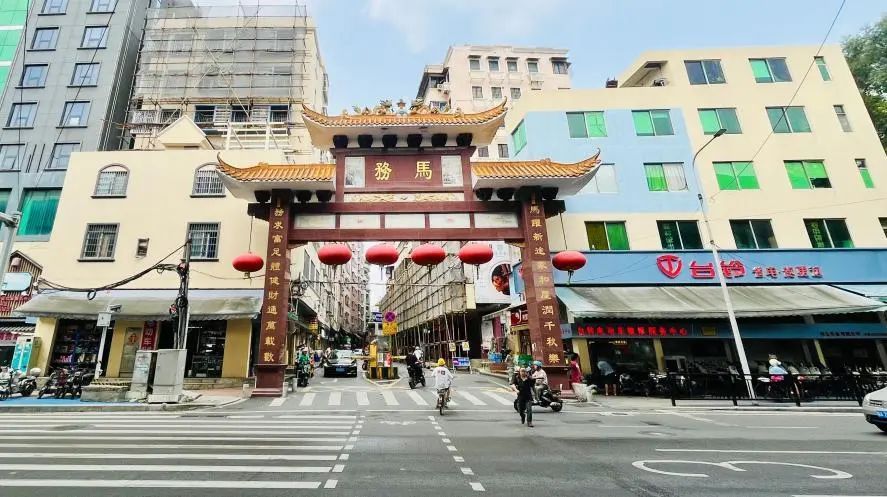 浅黄色的墙面,浅蓝色的商户招牌,这些清新靓丽的色彩与蓝天白云交相辉映,广花路马务牌坊两侧的建筑外立面焕然一新。