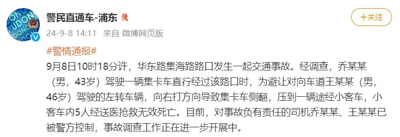 目前,对事故负有责任的司机乔某某、王某某已被警方控制,事故调查工作正在进一步开展中。