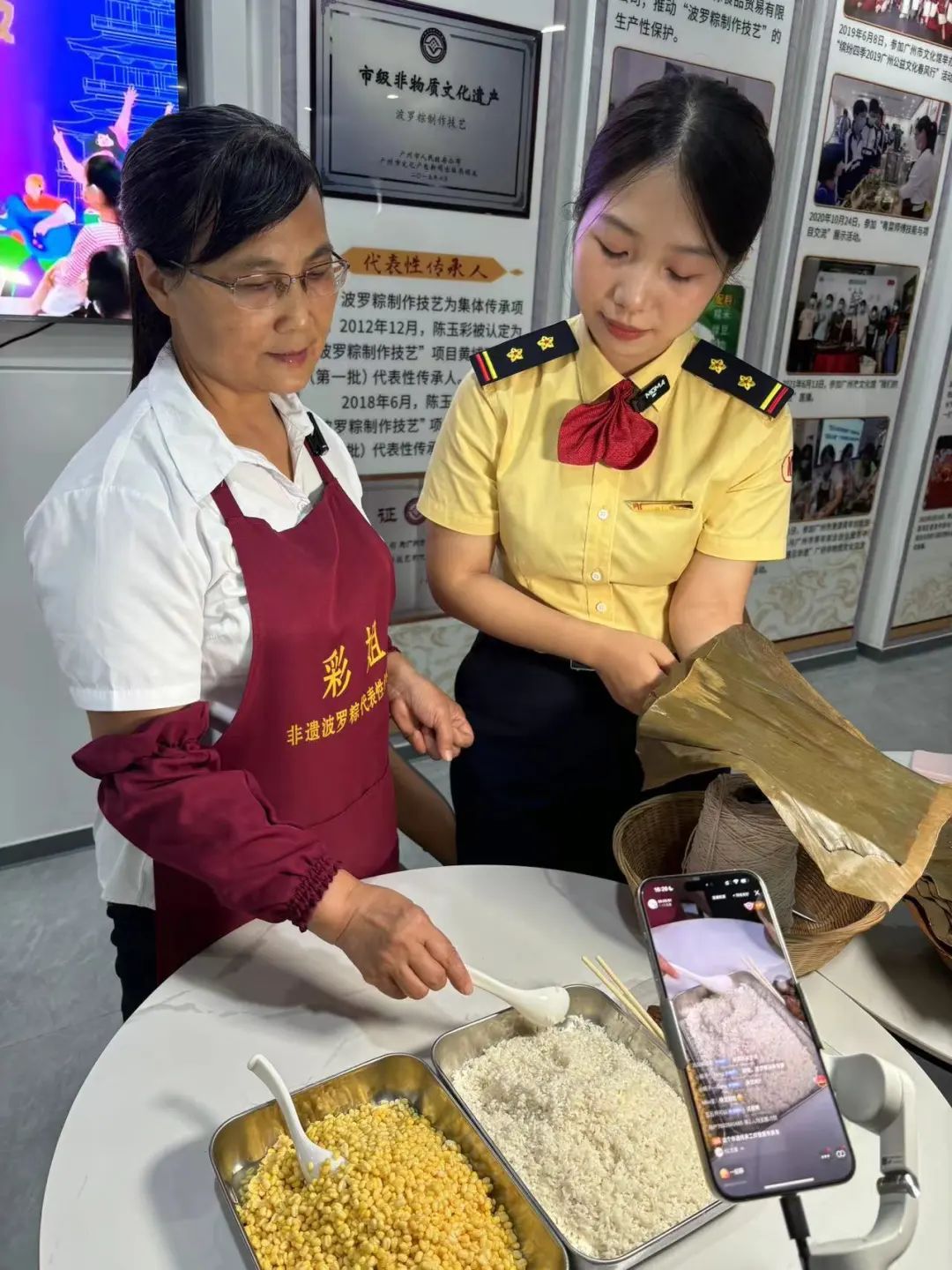 直播现场,市级非遗项目波罗粽制作技艺传承人陈玉彩和区级非遗项目波罗鸡制作工艺传承人张丽添作为特邀嘉宾,也现身直播活动现场,更是掀起了直播活动的高潮。在两位老师的亲身示范下,近镜头呈现出“彩姐波罗粽”蒸煮8小时的传统风味,以及波罗鸡38道制作工艺的独具匠心,令众人不禁纷纷惊叹非遗的博大精深和精妙绝伦。