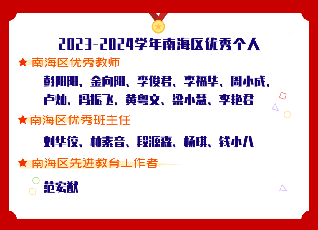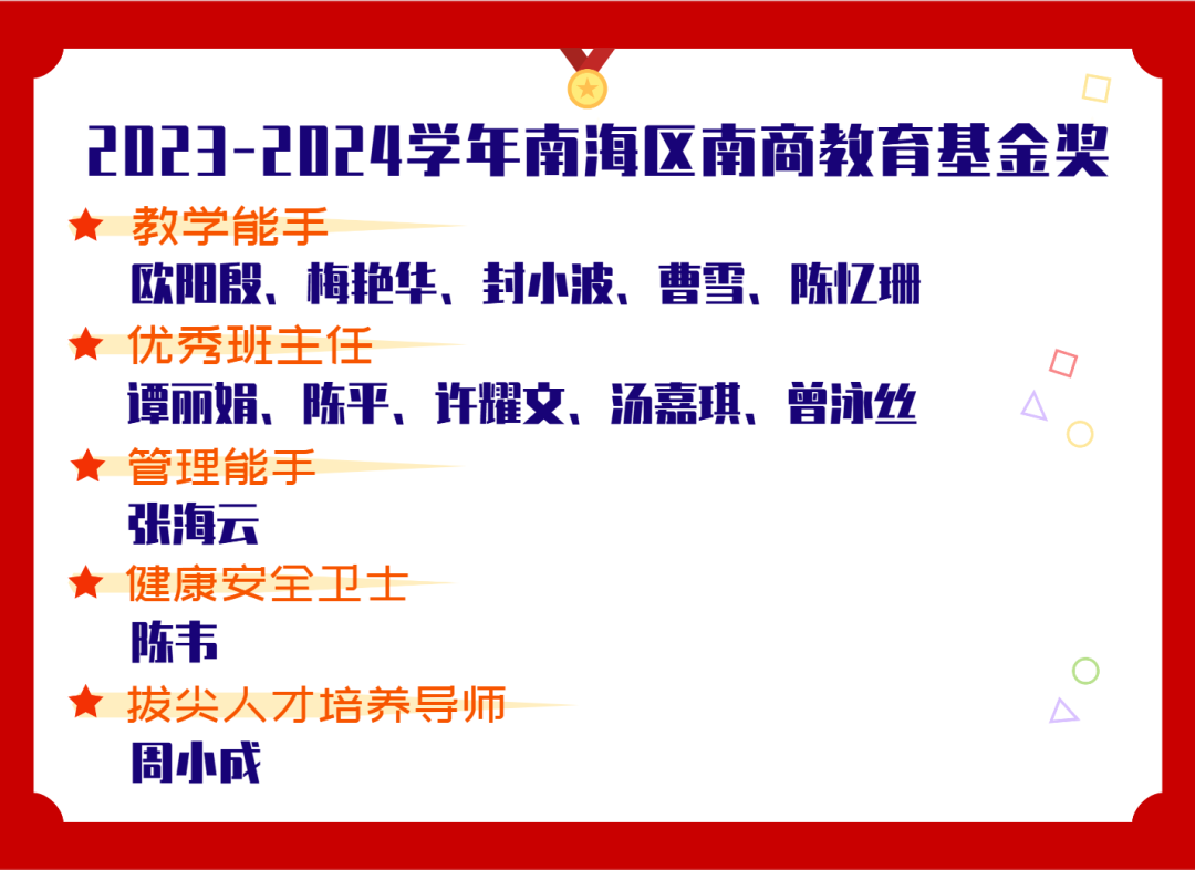 9月6日,在佛山市南海区2024年全区教育大会暨“南商教育基金”奖教奖学大会上,南海外国语学校蝉联南海区英才培养先进单位唯一的珠峰奖。周小成老师荣获南商教育基金拔尖人才培养导师奖;杨芳正同学获国家强基计划学科竞赛优秀奖。学校拔尖后备人才培养成效显著,备受肯定。