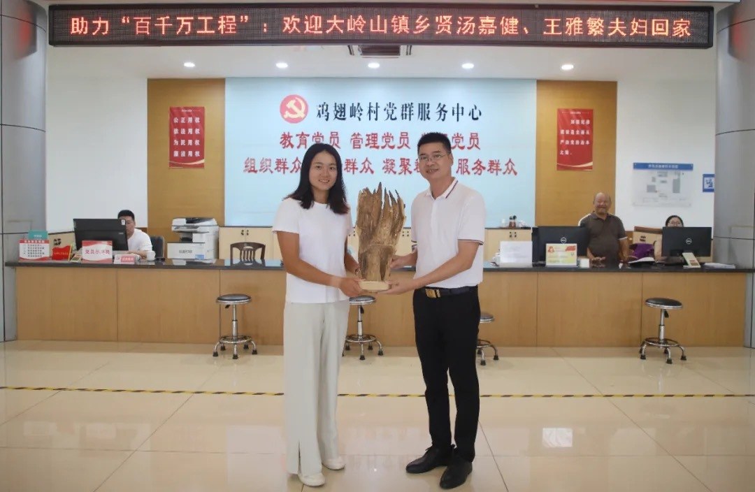 在随后的座谈会中,镇党委副书记邓小强、镇党委委员叶淑帆与汤嘉健、王雅繁伉俪进行了亲切交流。邓小强对二人心系家乡发展表示感谢,他指出,大岭山镇大力推进“百千万工程”,就是要提升民生福祉,满足人民对美好生活的新期待。他欢迎二人多回家看看,继续为家乡的发展贡献智慧力量,激励大岭山青少年奋发向上、拼搏进取。汤嘉健、王雅繁伉俪感慨地说,这次“回家”之旅,不仅是一次对家乡发展的深入探寻,更是一次心灵的归栖,他们愿意成为家乡发展的推动者和青少年奋发向上的激励者。