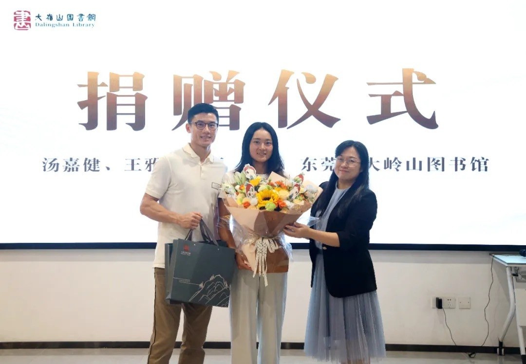 随后,汤嘉健、王雅繁伉俪一行来到了大岭山图书馆,看到丰富的馆藏书籍、形式多样的文化体验空间以及认真专注的读者,二人不禁为大岭山近年来的文化事业发展点赞。热心公益事业的他们,为图书馆捐赠了一批书籍,以实际行动支持家乡的文化建设,助力大岭山镇“百千万工程”。镇党委委员叶淑帆为其献上鲜花和文创以示感谢,图书馆馆长王景发回赠了《捐赠证书》。