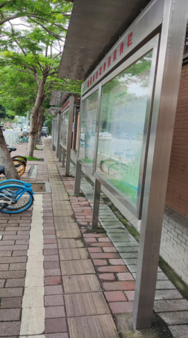 “宣传栏挡在路中间,平时通行很不方便,希望对这个宣传栏进行改进。”平时上班经常路过的市民小王向街道反映。年代久远的街道旧宣传栏为立牌式,设置在街道大院外道路的人行道上,其前侧还有树木矗立,让本就不宽敞的人行道变得更加狭窄,严重影响居民群众通行。并且由于长期裸露在外,宣传栏表面褪色脱落,不锈钢立架也变形破损,严重影响市容市貌。