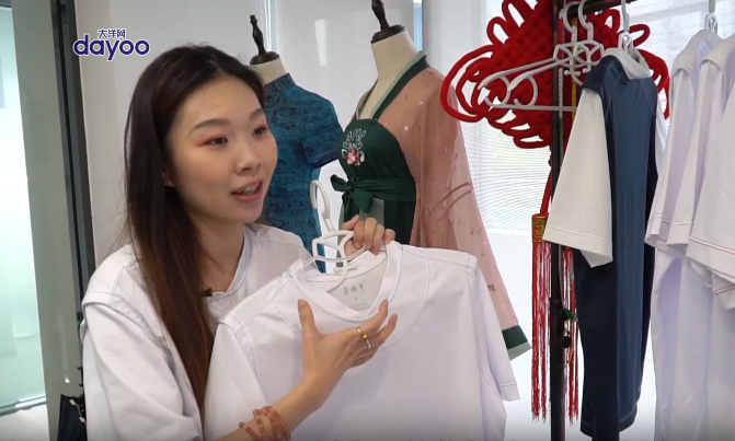 随着汉服热的兴起,汉服等传统服饰逐渐走进大众生活,不少景区有汉服巡游活动,还设置了“穿汉服免门票”等活动,汉服热也带动了新中式服装的兴起。这对于从事服装设计的潘嘉铟来说,是一种机遇:“这是个很好的现象,代表着国人的传统文化观念越来越深,对于我自己来说,去做国风服饰也会更加有前景。”在采访中,潘嘉铟穿着一件比较特殊的白色T恤,她向我们介绍,这是她与师傅李柏亨创作的最新作品——华常服。