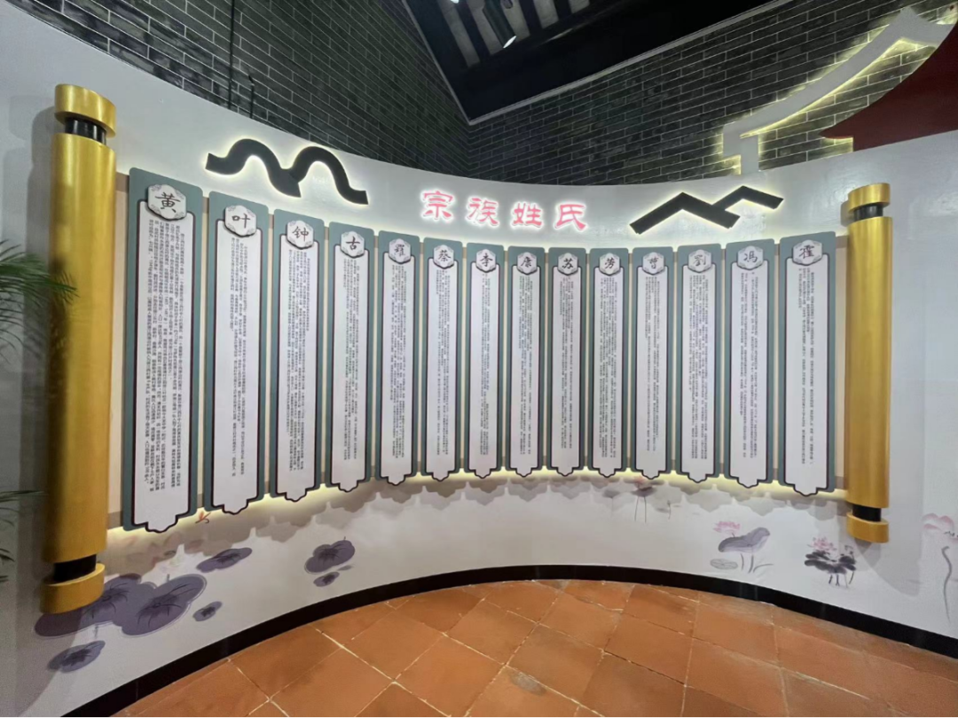 进入展馆,首先映入眼帘的是乡土厅,记录着傍江西村从1740年至2024年开村建土的历史沿革;往前是宗族厅,该厅记录着村中14个姓氏的来源,随着社会发展、人口迁移以及新中国户籍制度、行政区域划分的变革,定居在傍江西村的有黄、叶、钟、古、罗、蔡、李、康、苏、劳、曹、刘、冯、霍14个姓氏。