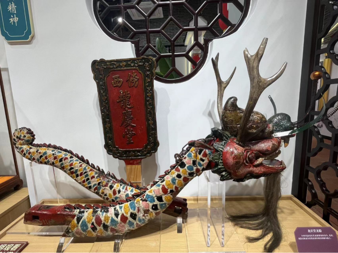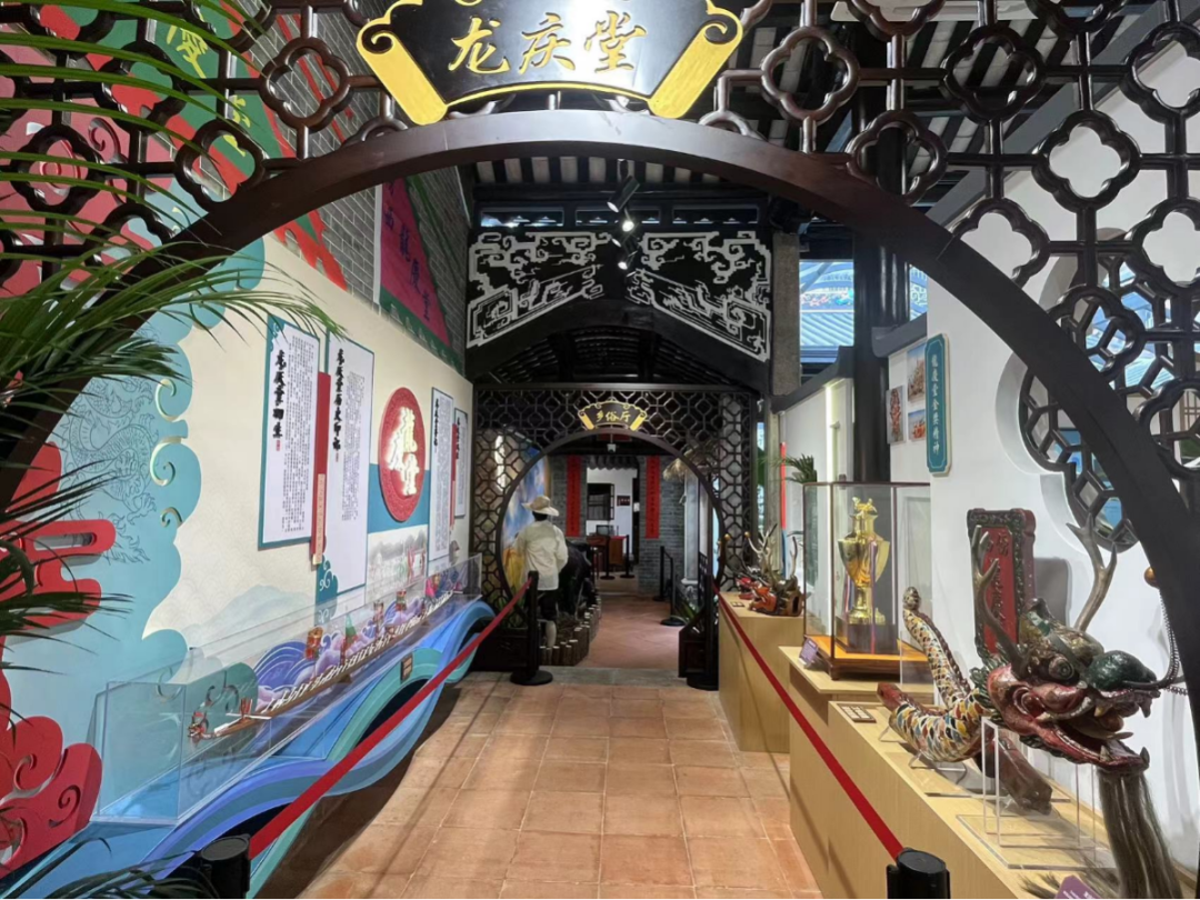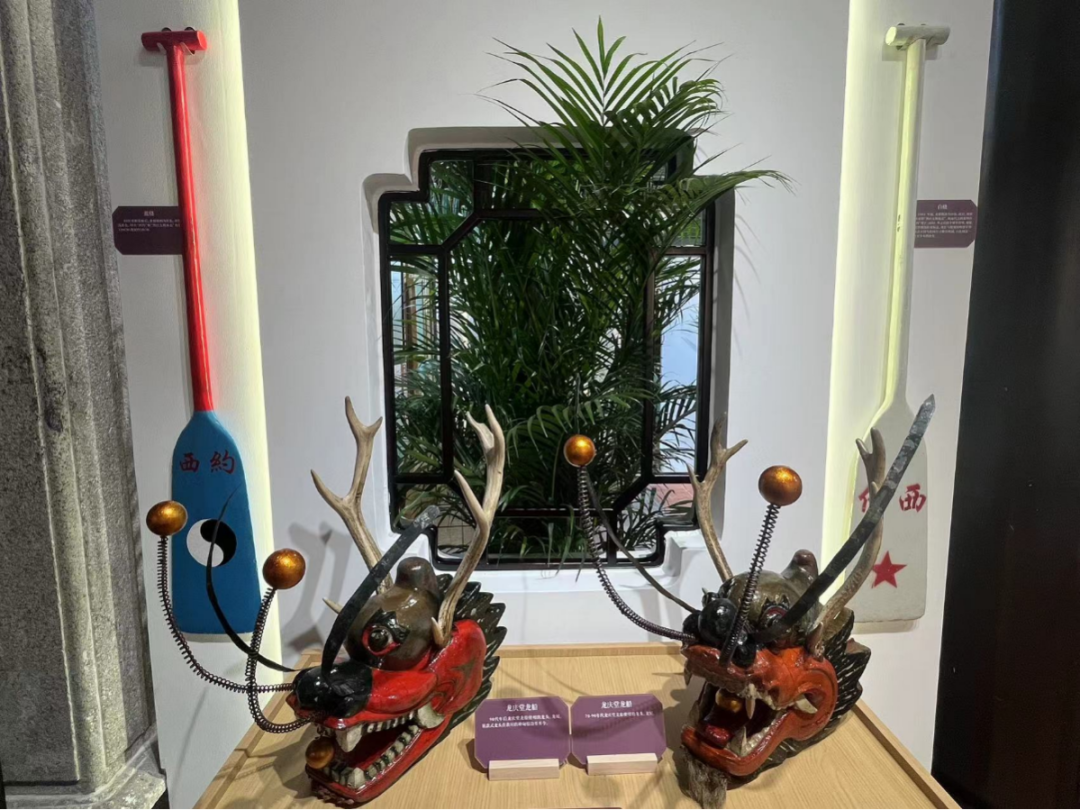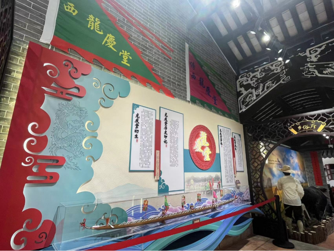在“龙庆堂”厅,展示着傍江西村龙船会的历史发展以及风采成就,厅内摆放着的傍江西村第一、二、三代龙船头、龙船尾,还有龙船桡、龙船模型以及奖杯,娓娓道出“龙庆堂”龙船会的历史辉煌成就。