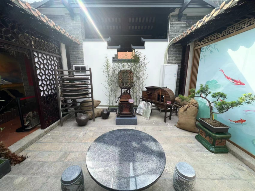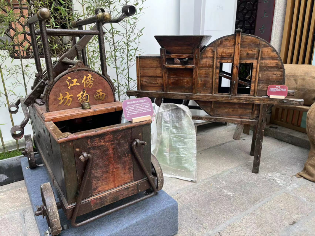 乡俗厅、乡情园的实物展示是村史展馆的一大亮点。乡情园中一架重新漆油翻新的清代火车尤为引人注目,这是清代至近代傍江西乡的重要设备。