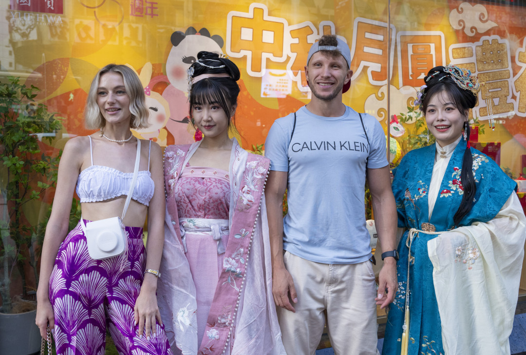來自波蘭的女士Olga在購物時看到了這兩位身穿華服的少女,雀躍着向前與少女們提出合照的請求。不少路過的街坊見狀也紛紛加入其中,以櫥窗為背景,與漢服少女們合照。中秋的櫥窗與漢服完美融合,相得益彰,令來往的路人為之側目。