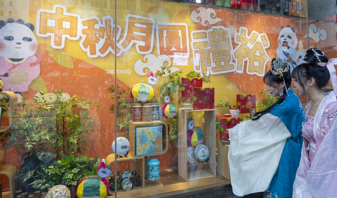 中秋佳節將至,越來越多的中秋文化元素出現在中國香港的街頭。兩位少女身着中國傳統服飾漢服在鬧市中行走,並被櫥窗中的中秋展品吸引駐足。與此同時,她們也成為了路人眼中一道靚麗的「風景線」。
