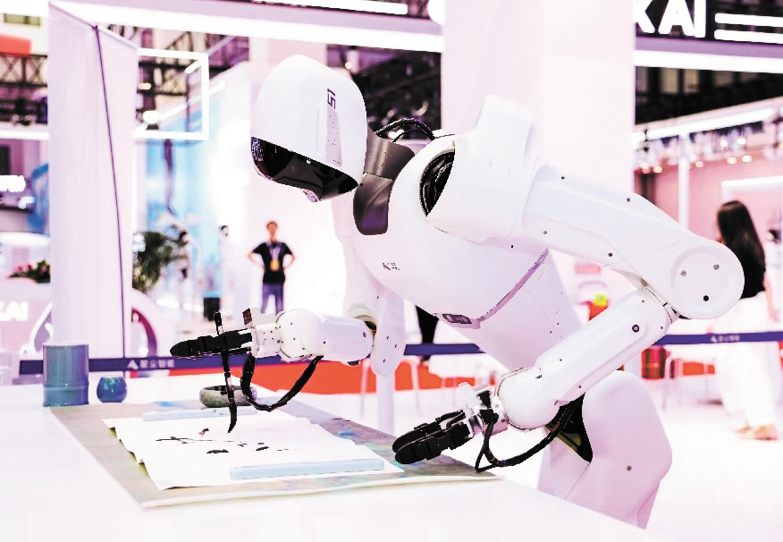 世界机器人大会上,人形机器人挥毫(广州日报记者张露摄)
