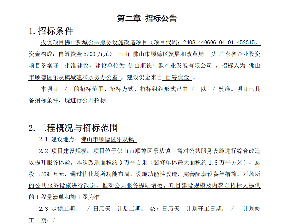 招标公告显示,项目位于佛山市顺德区乐从镇,需对公共服务设施进行综合改造以提升服务体验。本次改造面积约3万平方米(装修单体最大面积约1.8万平方米),总投5709万元,通过优化场所功能布局、设施功能性改造、完善配套设备等措施,对场所的公共服务设施进行改造,推动公共服务提质增效。项目建设规模及内容以招标人提供的工程量清单和施工图为准。