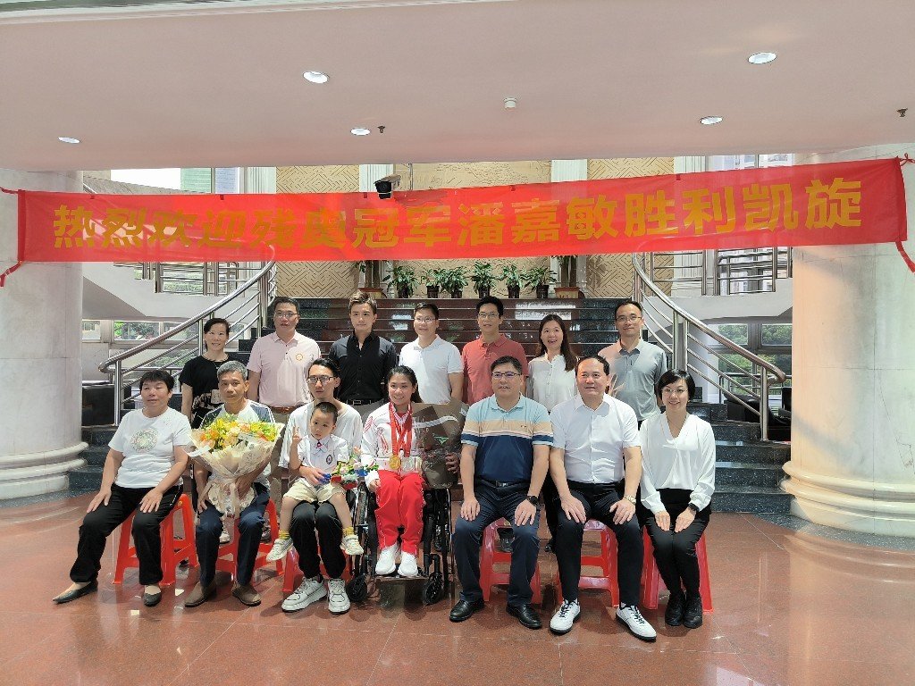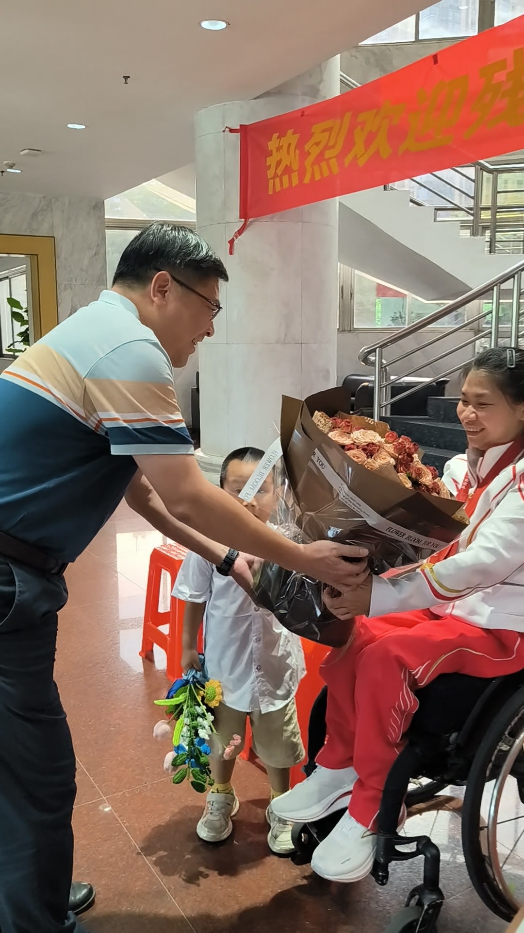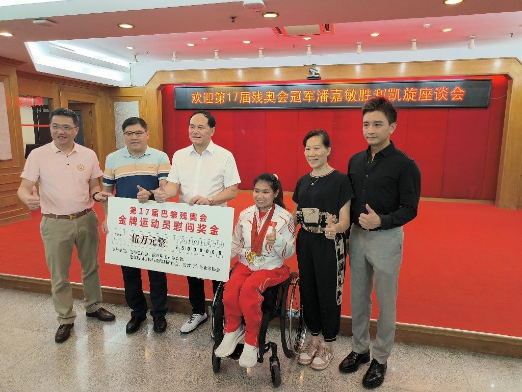9月11日下午,巴黎残奥冠军潘嘉敏回到家乡佛山市顺德区伦教街道。伦教街道党工委、办事处为潘嘉敏举行凯旋座谈会,致以鲜花祝贺,并送上五万元慰问奖金。