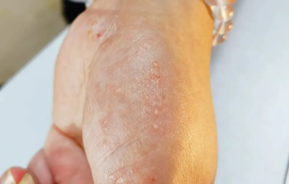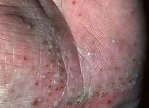 识别:水疱一般为米粒大小,群集于手掌、脚底以及手指和脚趾两侧,常呈对称分布。严重者水疱可融合成大疱,有不同程度的瘙痒及烧灼感,通常每年会定期反复发作。