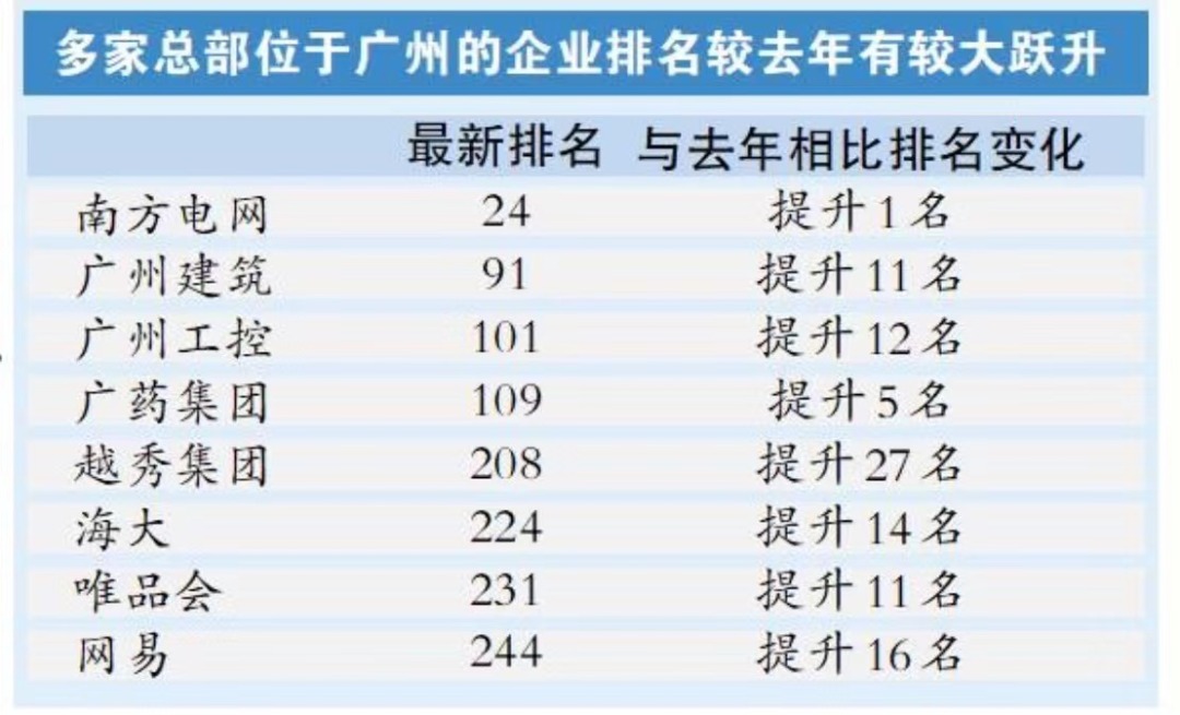 值得注意的是,多家总部位于广州的企业,排名较去年都有较大跃升。其中,南方电网排名24位,跃升1位;广州建筑排名91位,跃升11位;广州工控排名101位,跃升12位;广药集团排名109位,跃升5位;越秀集团排名208位,跃升27位。