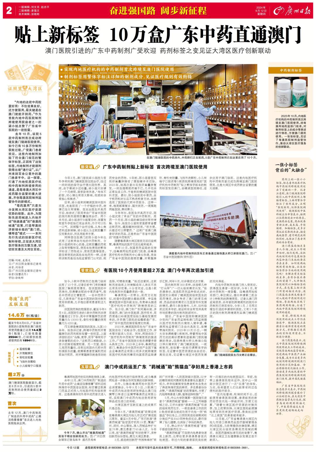 2023年10月,内地医疗机构的中药制剂首次跨境至澳门医院使用,经粤澳两地药监部门批准,对制剂标签上的成分等表述进行修改,方便澳门居民使用。一张张标签,见证了粤澳医院制剂监管协作,,推动大湾区医疗服务的创新联动。