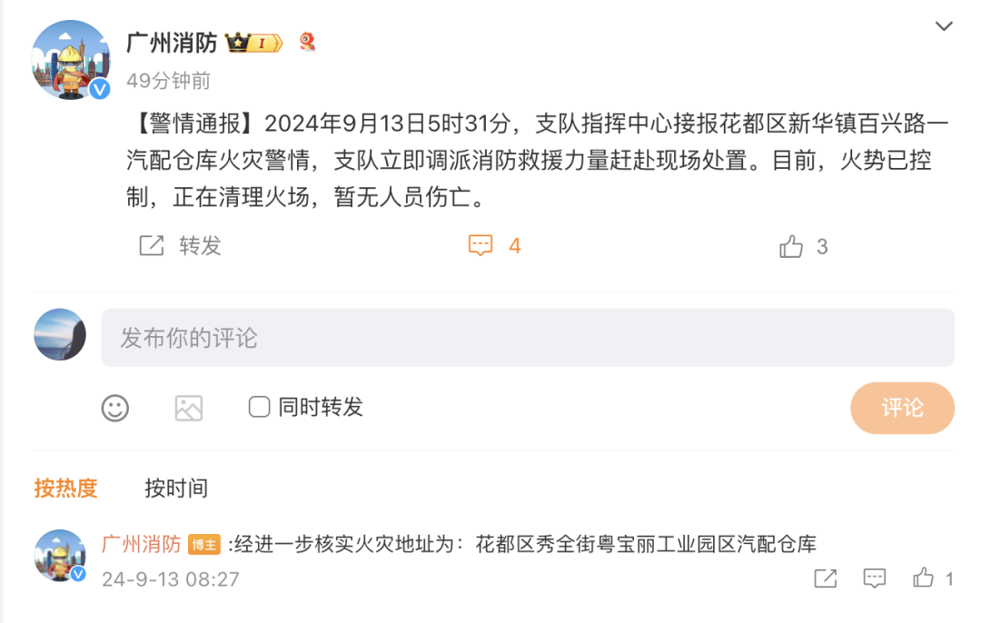 广州消防9月13日7时41分通报,2024年9月13日5时31分,支队指挥中心接报花都区新华镇百兴路一汽配仓库火灾警情,支队立即调派消防救援力量赶赴现场处置。目前,火势已控制,正在清理火场,暂无人员伤亡。