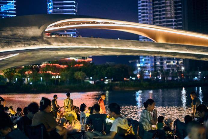 聚星桥一桥连三岸,在蕉门河岸点亮夜市文化,成为社交媒体上的热点话题。从聚星桥桥头到太极公园,柠檬茶、冰粉、牛杂、炸串、烧烤等各种各样的夜市小摊沿路排开,客流如织,寻草地上的位置坐下,好不惬意。
