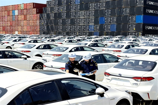 关员在对国产二手汽车开展实地巡查。
