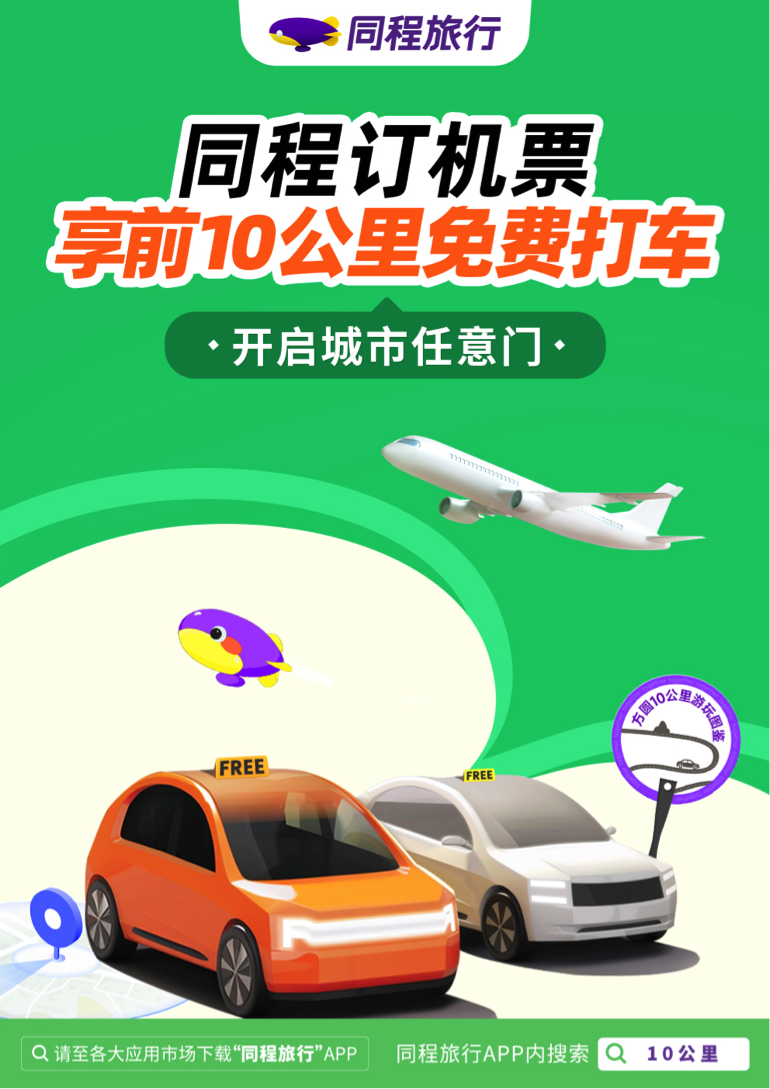 用户在同程旅行APP搜索“10公里”、“免费接送站”关键词,即可查看相关攻略。在参与城市实际预订机票或火车票时,页面会有“前10公里免费”、“前5公里免费”提示,按照页面提示操作即可享受对应免费接送服务。