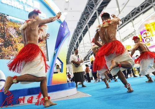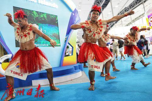 来自太平洋岛国汤加的演员在展会上表演当地特色舞蹈。