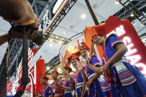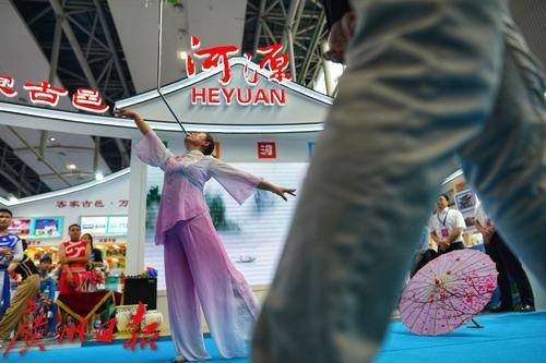 乳源瑶族女青年在展会现场表演民族歌舞。