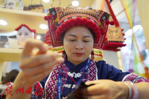 乳源瑶族女青年在展会现场仔细绣制民族特色绣花。