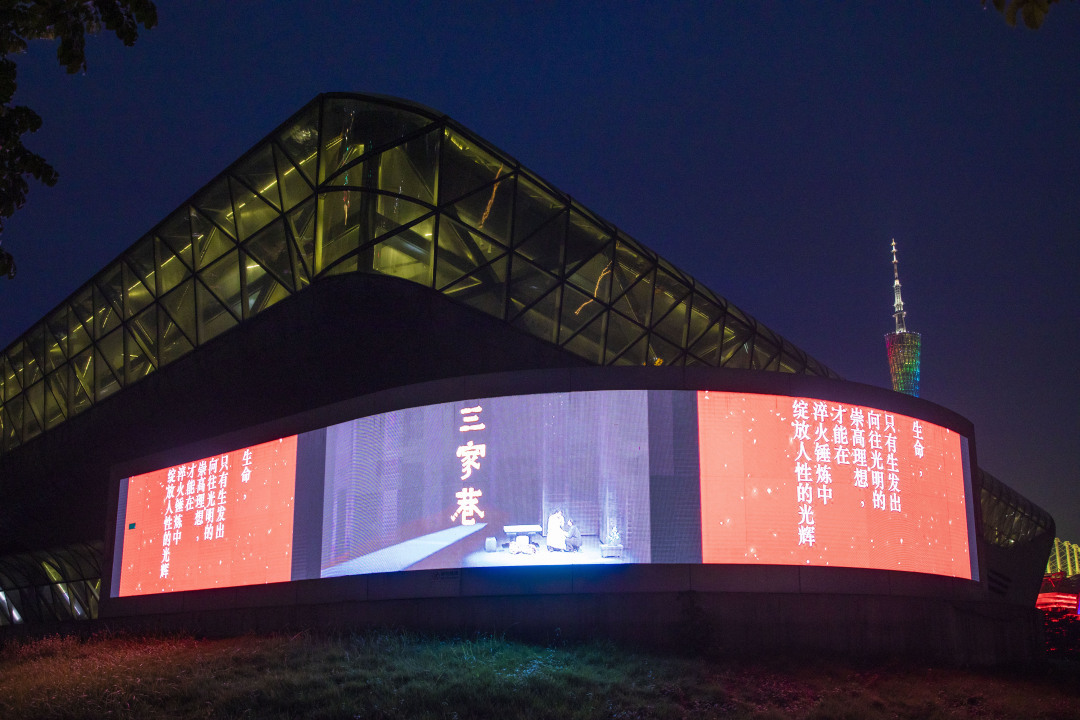 大幕开启,一声惊雷后,原著作者“欧阳山”现身,粤语主题歌响起,“欧阳山”坐在石凳上,娓娓道来,向观众介绍住在三家巷里的几户人……