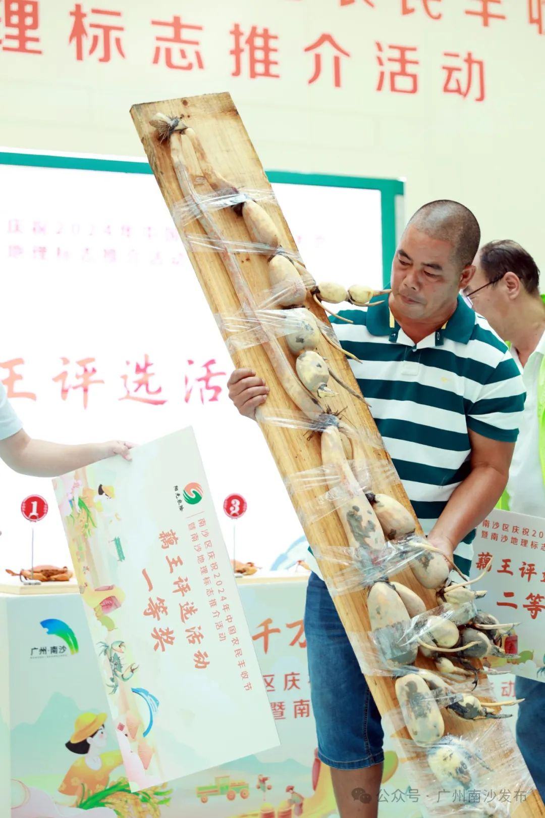 “藕王”“蟹王”和“蟹后”评选活动首先拉开帷幕,通过现场称重,来自农户冯少华采摘的一根莲藕以6.37kg的净重摘得“藕王”桂冠;广州市南沙区兴源水产种苗有限公司选送的雄蟹以742g净重问鼎“蟹王”。