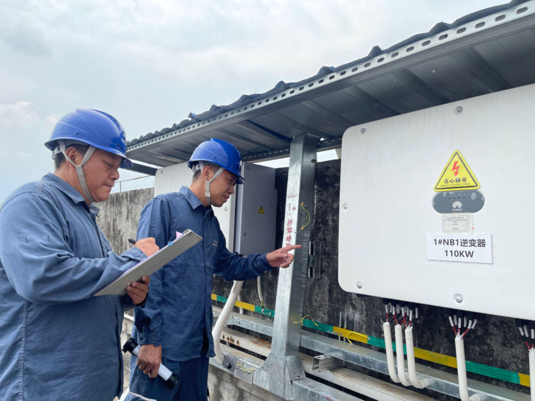 广东东莞西北区供电局工作人员检查月饼生产厂家屋顶光伏设备