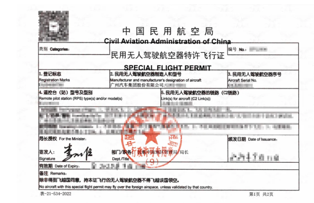 广汽飞行汽车GOVE获颁中国民用航空局民用无人驾驶航空器特许飞行证