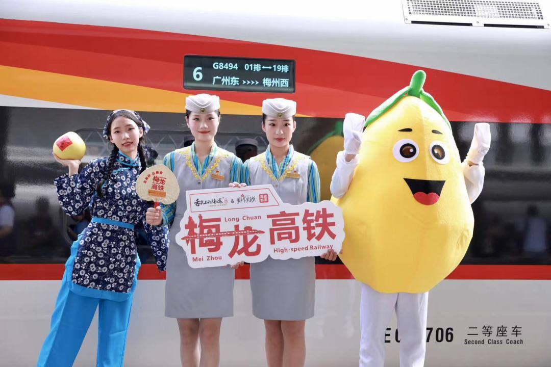 梅龙高铁通车运营,广铁集团在列车上精心准备了浓郁客家风味的餐饮美食,餐车还特意准备了多个梅州特产蜜柚,让旅客伴着柚香,用享受一杯蜂蜜柚子茶、一顿客家菜餐食的时间,轻轻松松抵达目的地。