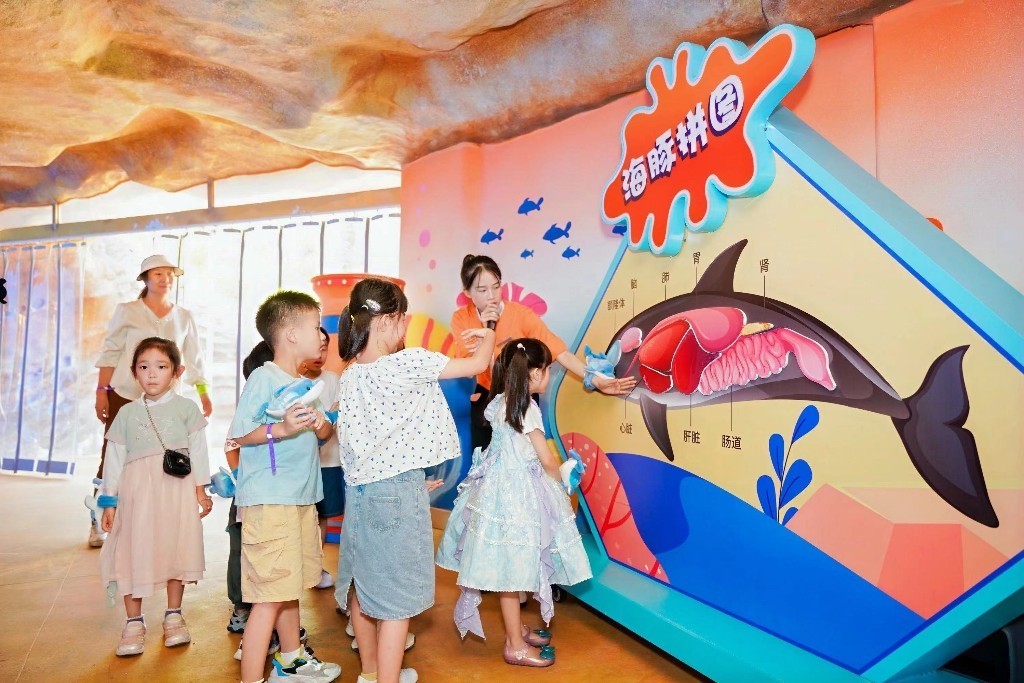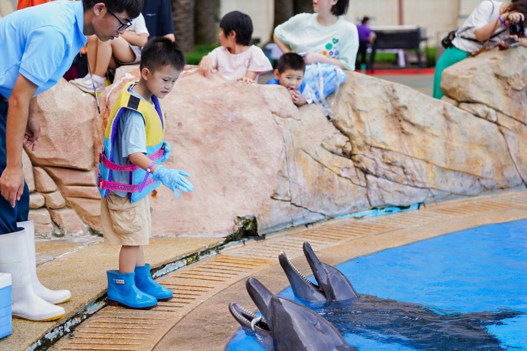 随后,在全国首个酒店“海豚池”内,小朋友们向海豚送出了承载心意和创意的“果冻月饼”。海豚们欢快地从蓝色水面跃出,向大家打起了招呼。和海洋动物们的亲密互动,让小朋友们笑开了花,也让家长们交口称赞。“和海豚一起过生日,帮海豚、企鹅做月饼,这些活动有创意也很有意义。孩子体验后就一直说要和海豚做朋友,要保护海洋。”